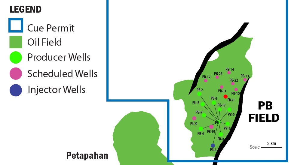 Under the current development plans, twenty production wells and three injection wells are approved for the PB field. Including the recently completed wells, there are currently eighteen oil production wells and one water injection well in the field. The remaining wells are expected to be drilled during this calendar year. Production performance and field analysis will then be undertaken, with the potential for more development wells to be proposed.