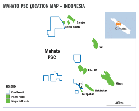 Cue holds a 12.5% interest in the Mahato PSC located in Central Sumatra, Indonesia. Oil production from the PB field within the PSC has been ongoing since early 2021, following the drilling of discovery wells in late 2019. The Central Sumatra Basin hosts some of Indonesia's largest oil fields, including the Minas and Duri fields.